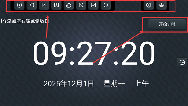 1、在计时主界面,点击顶部功能栏的图标后,再点【开始计时】,就能启动计时功能啦。