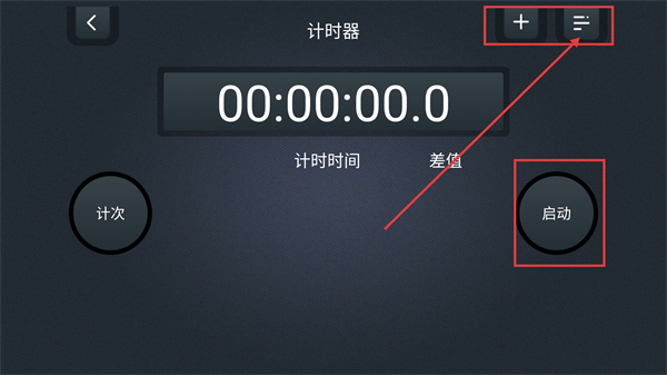 2、进入计时器页面,点击右上角的【+】配置计时后,再点【启动】按钮,就能开始计时啦。