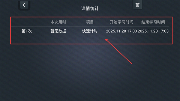 3、在详情统计页,可查看每次计时的【本次用时】【开始-结束时间】等信息,方便记录哦。