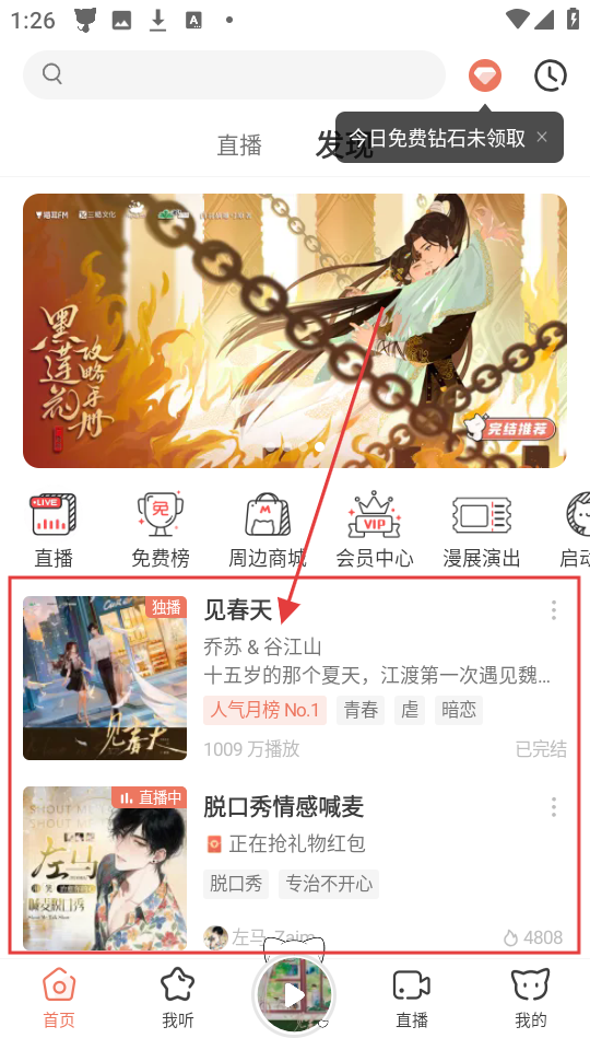 1、在发现页找到《见春天》,点击进入,开始收听精彩内容吧。
