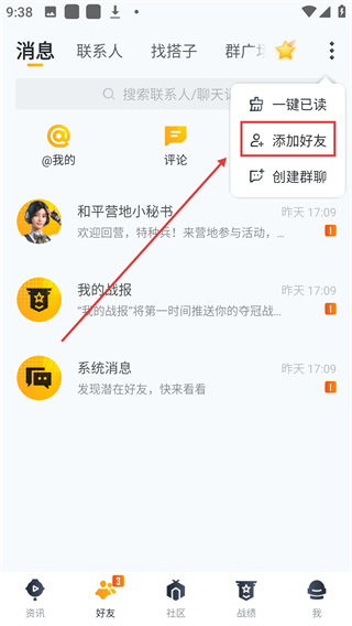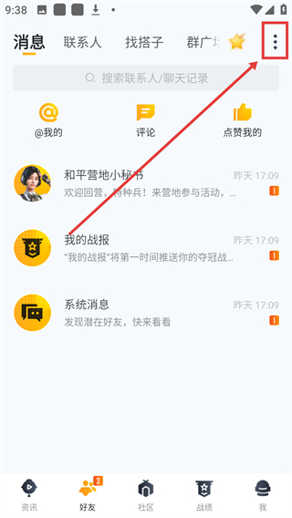 2、进入消息页后,点右上角的更多按钮,能展开功能菜单,获取添加好友等社交功能啦。