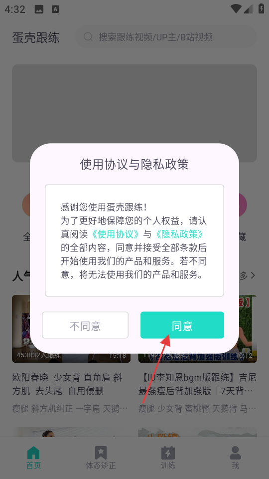 1、打开“蛋壳跟练”,点击【同意】接受使用协议与隐私政策。