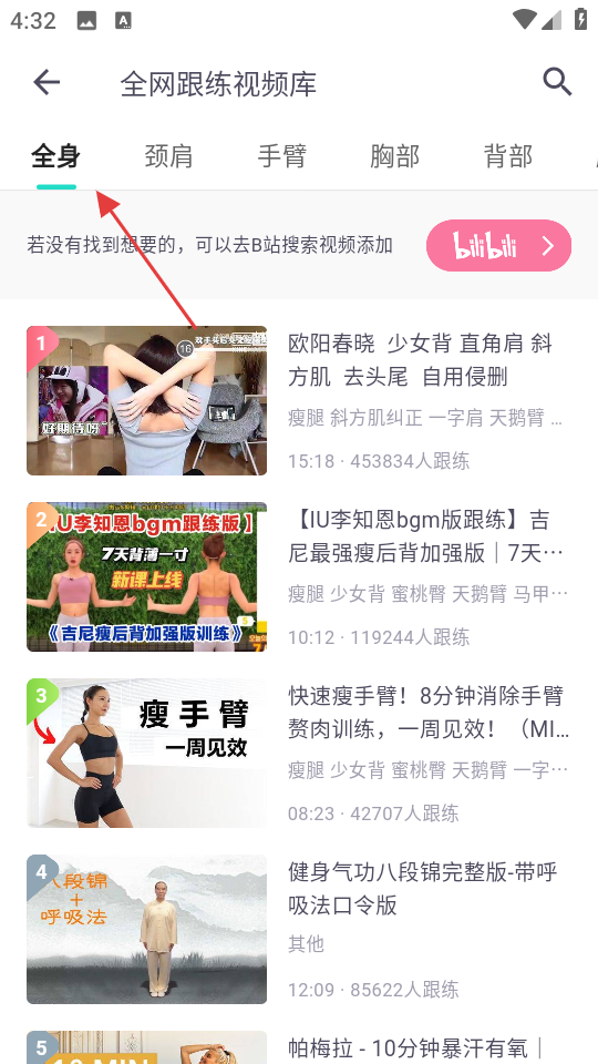3、在全网跟练视频库,点击【全身】等分类筛选视频。