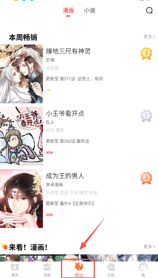 1、作为读者,你可以通过精选页快速了解平台的内容生态和流行趋势,看看哪些题材和画风更受欢迎。