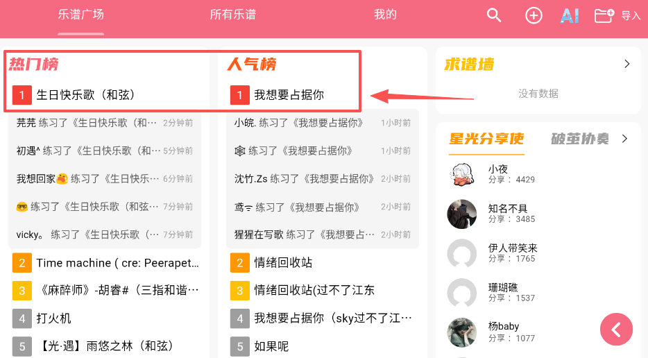 3、不知道练什么好,可以去热门榜和人气势看看,观察像小妮、冰竹Zs这样的用户都在练习什么,比如我想要占据你。