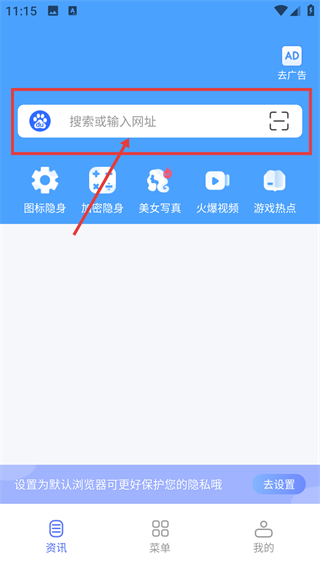 1、在浏览器的资讯页面,点击顶部的【搜索或输入网址】搜索框,可激活输入状态,准备查找内容啦。