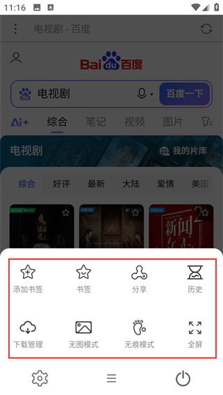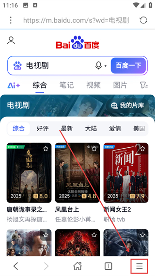 3、输入【电视剧】并搜索后,进入结果页面,点击底部的菜单按钮,可展开更多功能选项啦。