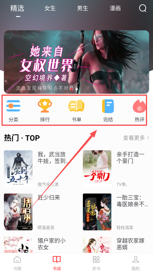 2、第二步是找书,主要使用“书城”板块,结合分类筛选和排行榜功能,效率会很高。