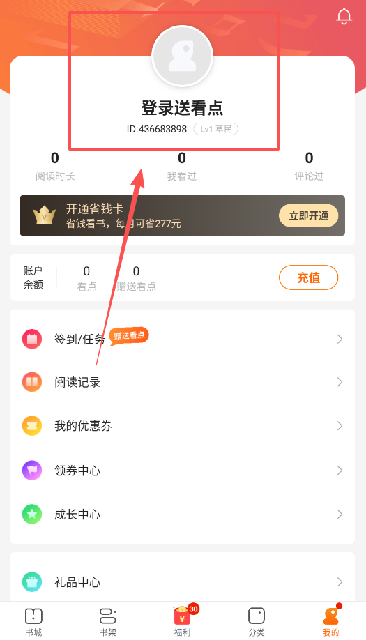 1、首先呢,你可以先完成账号登录,新用户好像有赠送看点的福利,就在我的页面能看到,然后记得去签到或者做任务。