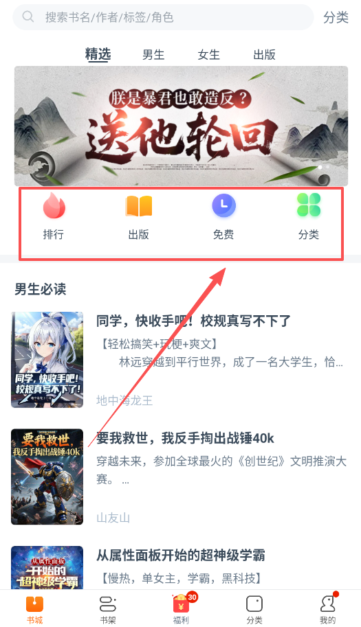 2、找书的话,主要是在书城页面,上面有精选、男生、女生和出版这些大分类,下面还会推荐一些热门书籍。