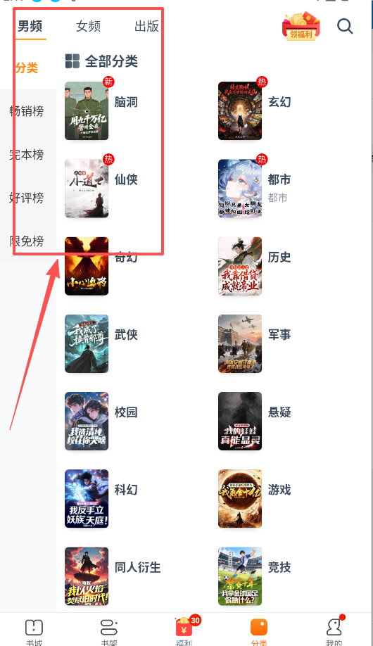 3、如果你想更精确地找特定类型的书,可以点分类,里面有男频、女频、出版,还有各种榜单和具体标签。