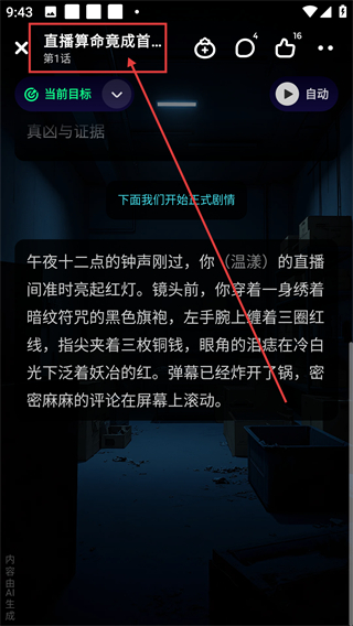 2、进入作品阅读页后,能看到剧情内容,点击顶部会进入作品页选择章节。