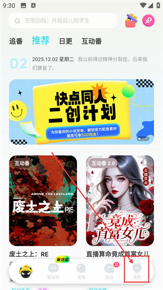 1、在推荐页点底部【我的】按钮能进入个人中心,后续可找到投稿签约等创作相关功能啦。