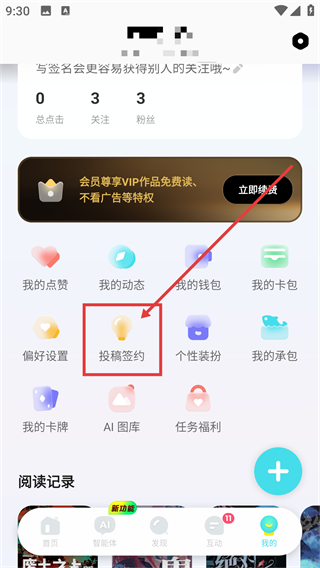 2、进入个人中心后,点【投稿签约】选项能进入作者相关页面,后续可了解投稿福利和要求哦。