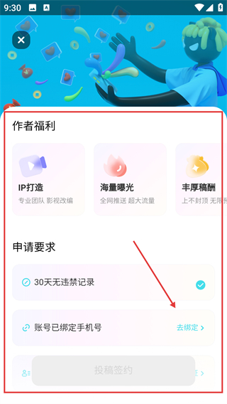 3、在投稿签约页,看到申请要求里需绑定手机号,点【去绑定】就能进入手机号绑定流程啦。