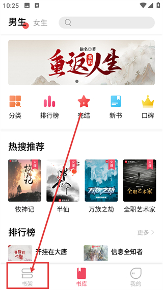 1、在书库页面点击底部【书架】选项,就能进入书架页面,准备添加喜欢的小说到这里啦。