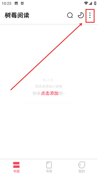 2、进入书架页面后,点击右上角的三点菜单按钮,就能展开功能选项,找到添加小说的入口哦。
