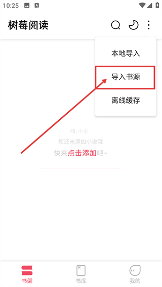 3、展开菜单后选择【导入书源】选项,就能进入书源导入流程,获取更多小说资源啦。