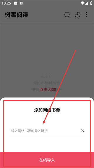 4、在添加网络书源弹窗中输入书源链接,再点击【在线导入】按钮,就能把对应书源的小说添加到书架啦。