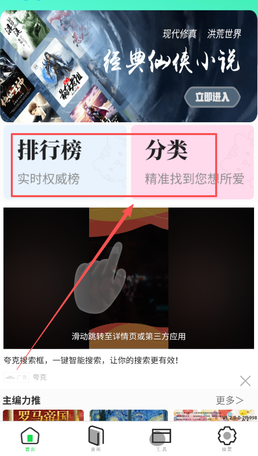 2、首页的搜索框是个宝藏工具,输入关键词就能直达目标,结合分类和排行榜浏览,再通过滑动跳转。