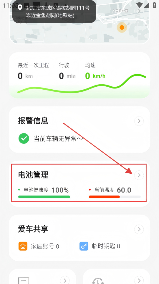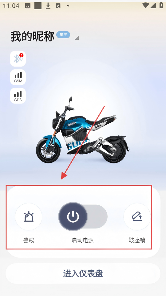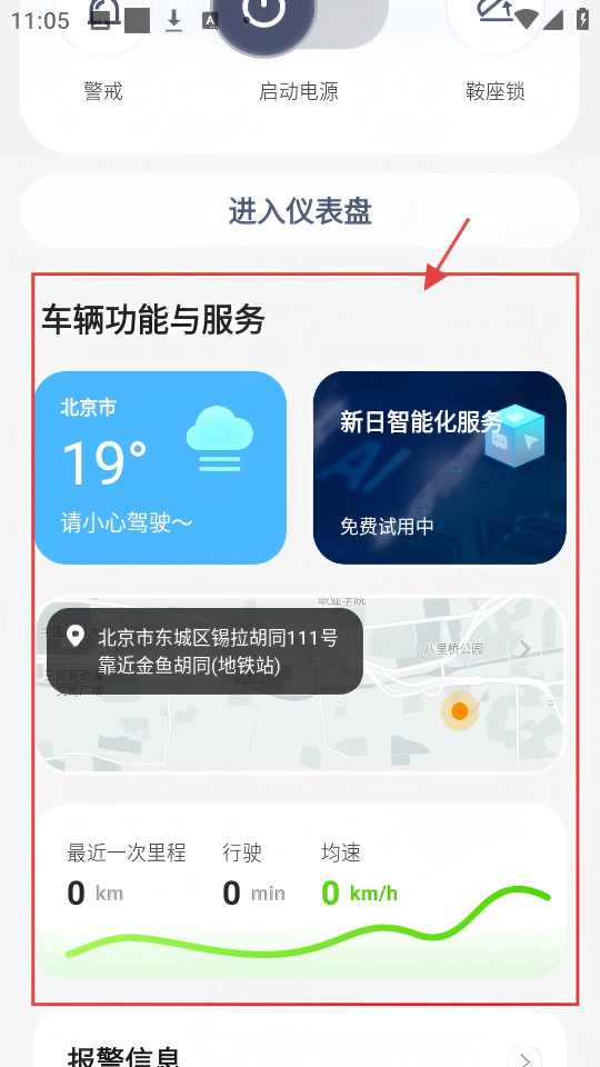 1、在车辆主界面,可看到【警戒】【启动电源】【鞍座锁】等功能,按需点击操作,超方便的。