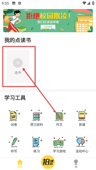 1、在应用首页,点【我的点读书】板块里的【选书】按钮,能进入年级册次选择页面哦。