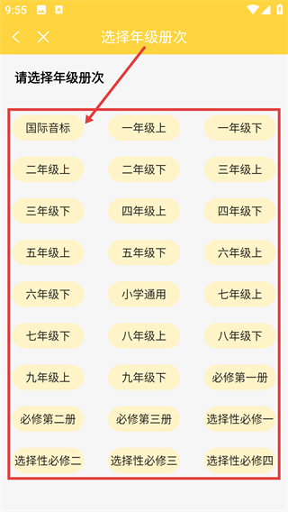 2、进入选择年级册次页后,选对应学习阶段(比如【国际音标】),就能进入该分类的教材选择页啦。
