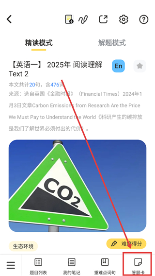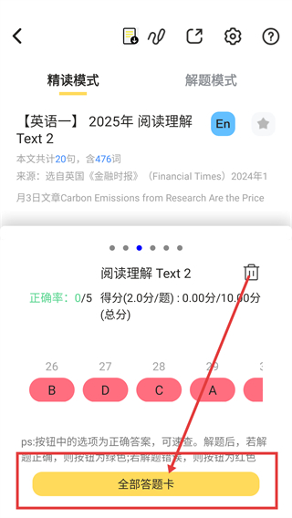 1、在英语阅读精读页面,点击底部的【答题卡】选项,可进入答题记录汇总界面,查看当前篇目的作答情况啦。