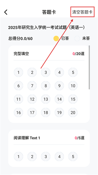 3、在整套试卷答题卡页面,点击右上角的【清空答题卡】选项,可触发清除答题记录的确认提示框呀。