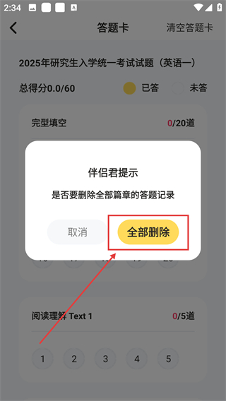 4、在弹出的提示框中,点击【全部删除】按钮,即可清除整套试卷的答题记录,重新开始作答啦。
