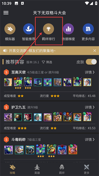 1、在云顶之弈攻略页面,点击顶部的【羁绊排行】按钮,就能查看各羁绊的实战数据排名啦,方便选强势羁绊哦。