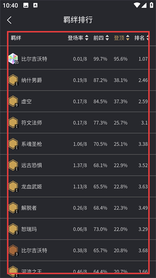 2、进入羁绊排行页后,能看到各羁绊的登场率、登顶率等数据,选排名靠前的羁绊(如比尔吉沃特)会更稳妥哦。