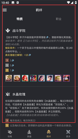 4、切换到羁绊的特质页,能看到羁绊的效果说明、棱彩条件等信息,助力搭建更合理的阵容组合哦。