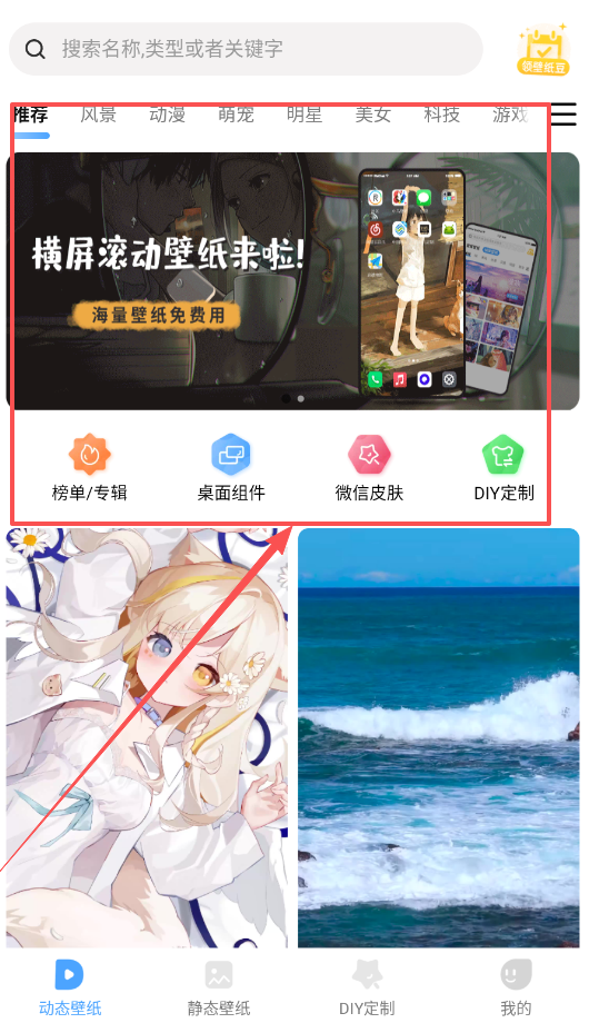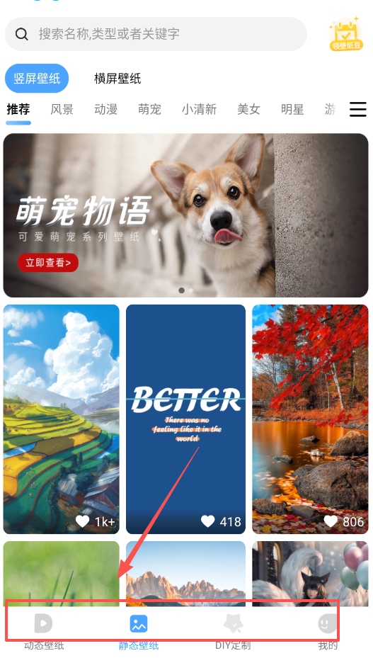 1、初次打开软件,可以先在发现页逛逛,那里有萌宠、小清新、游戏等丰富标签,也可以直接搜索。