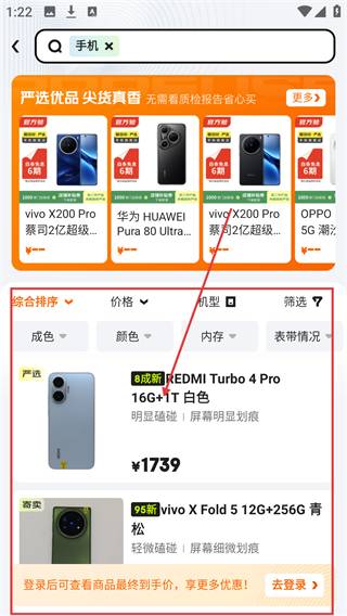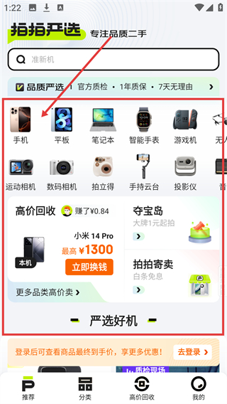 1、打开【拍拍严选】APP首页,点击分类栏中的【手机】选项,进入二手手机的商品列表页面,浏览相关机型啦。