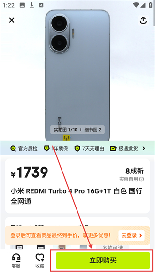 3、进入商品详情页后,确认配置与成色信息,点击底部的【立即购买】按钮,进入购买流程呀。