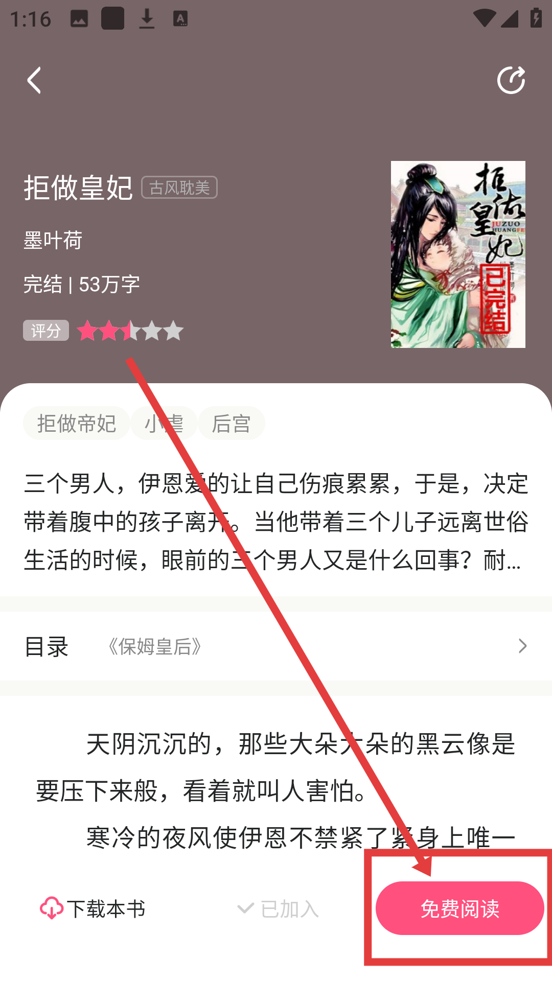 1、在《拒做皇妃》详情页点击【免费阅读】按钮,即可进入阅读页面开始看书啦。