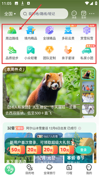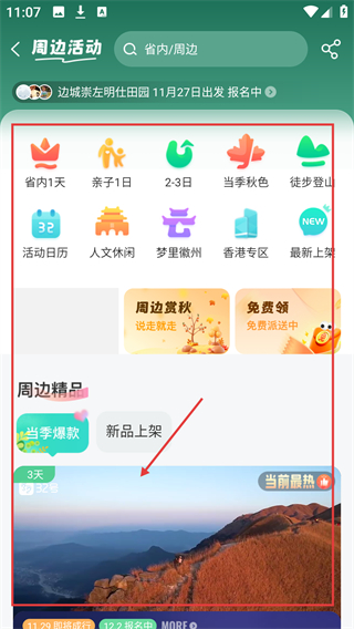 1、在APP首页,点击【周边路线】分类入口,即可进入周边活动专区,查看短途旅行的相关项目啦。