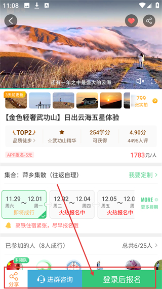 3、在项目详情页,确认行程与价格后,点击底部的【登录后报名】按钮,即可完成该旅行项目的报名流程呀。
