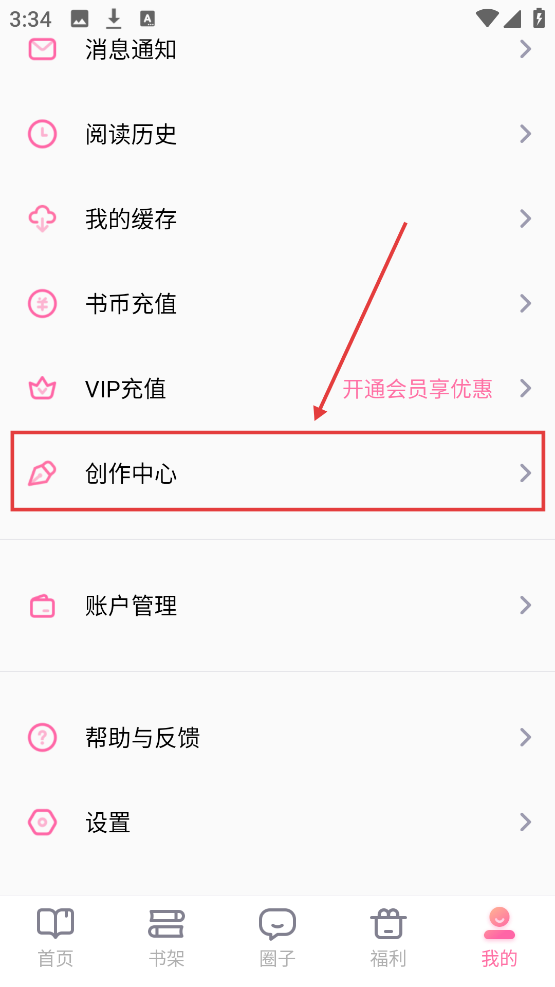 2、在个人中心页面,点【创作中心】,能进入创作相关页面啦。