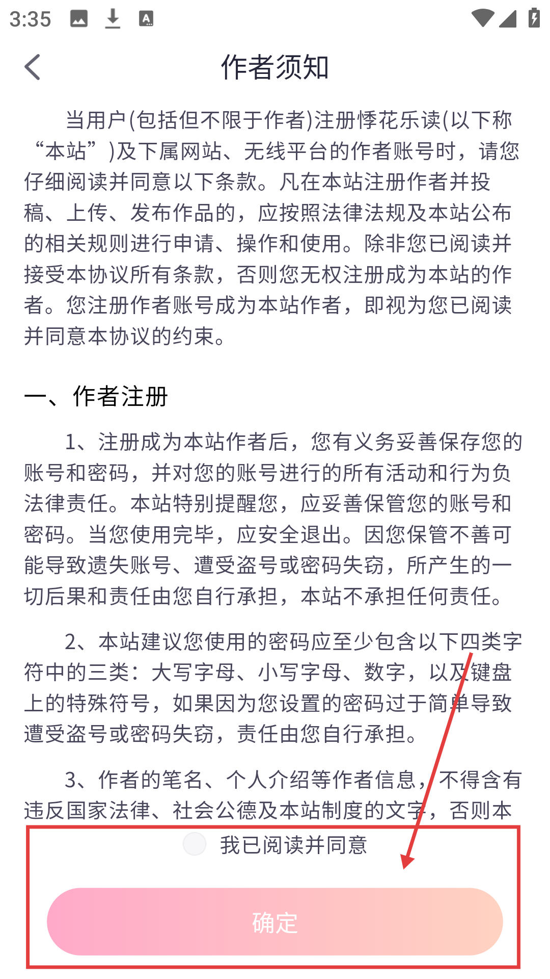 3、在作者须知页,勾选【我已阅读并同意】后点【确定】,可继续注册流程呢。