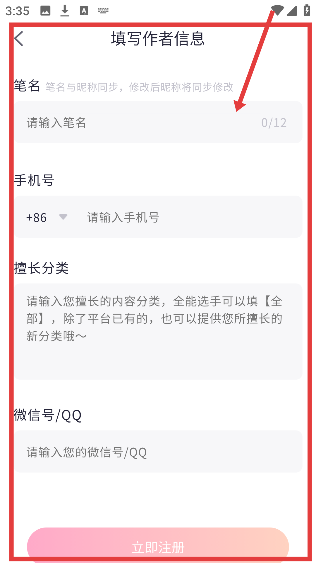 4、在填写作者信息页,输入笔名、手机号等信息后点【立即注册】,即可完成作者注册哦。