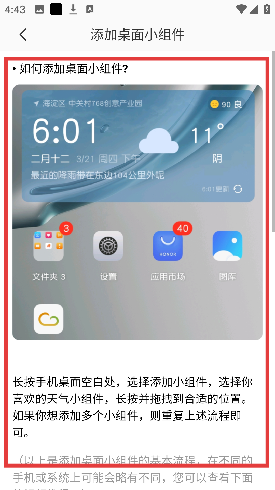 4、在添加界面查看添加流程,长按手机桌面空白处,选择添加小组件并拖拽到合适位置,完成添加啦。