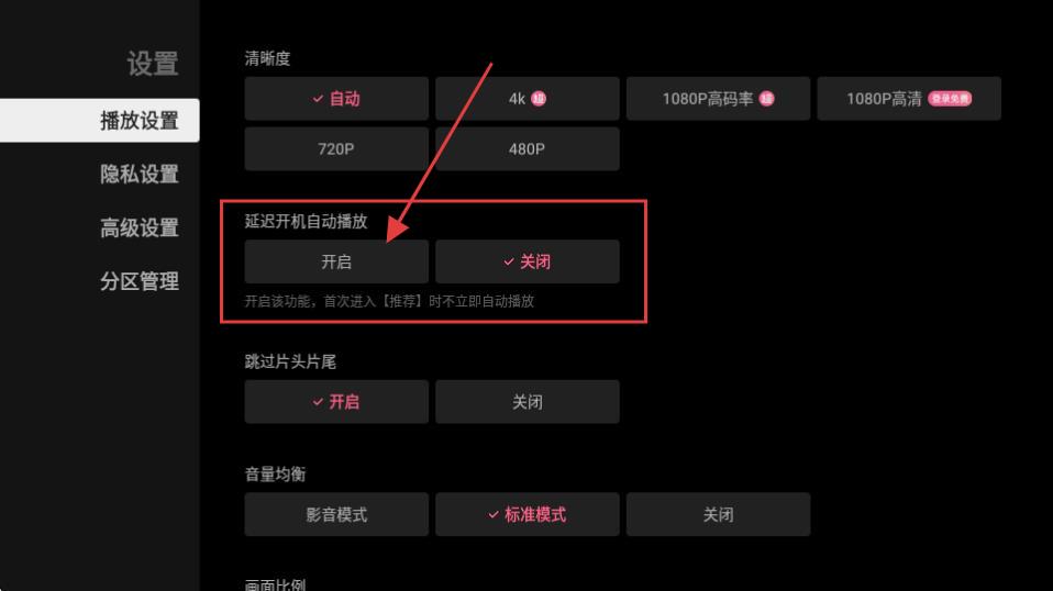 3、在设置页面的播放设置中,找到【延迟开机自动播放】选项,可选择开启或关闭状态呢。