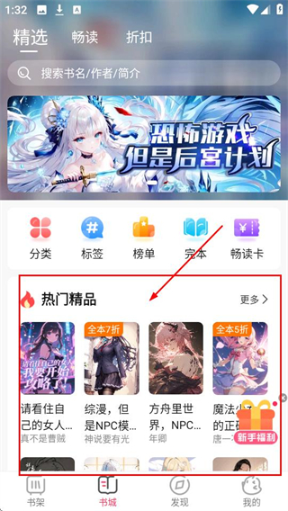 1、在书城页面,可浏览热门精品等板块的书籍,找到感兴趣的书籍啦。
