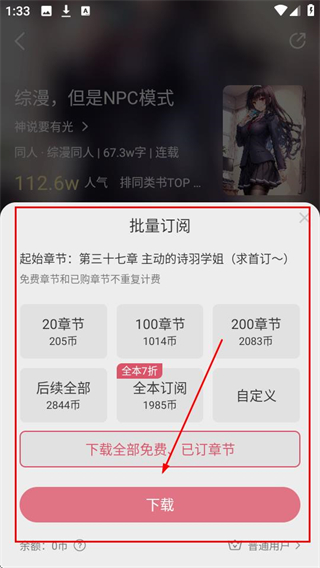 3、在批量订阅页面,选择下载章节范围,点击【下载】,可开始下载书籍章节啦。