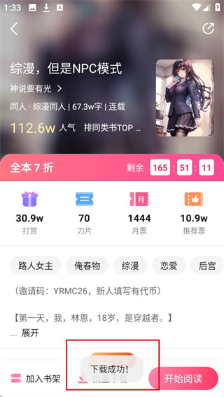 4、下载完成后,会提示“下载成功”,方便后续离线阅读哦。