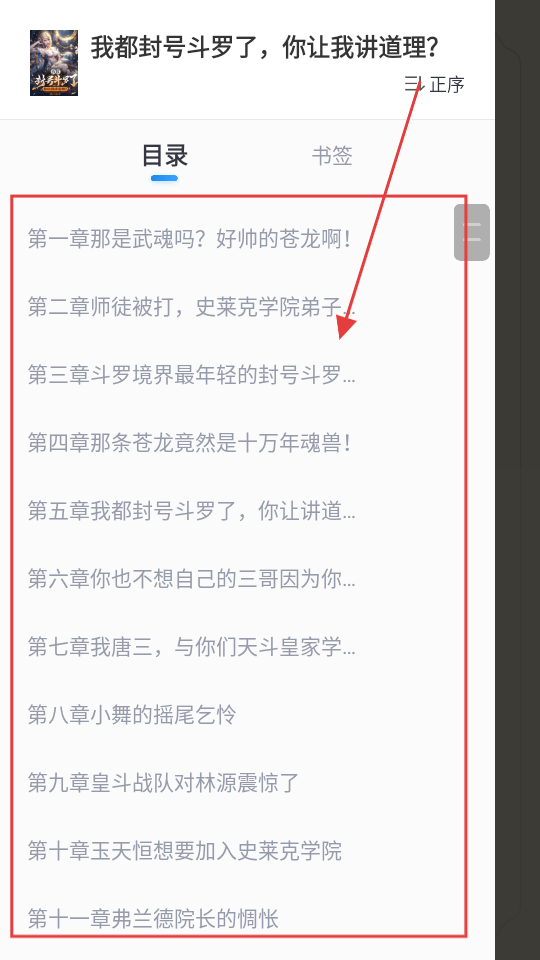 3、进入目录页面,能看到各章节列表,若想读某一章,点击对应章节标题呀。