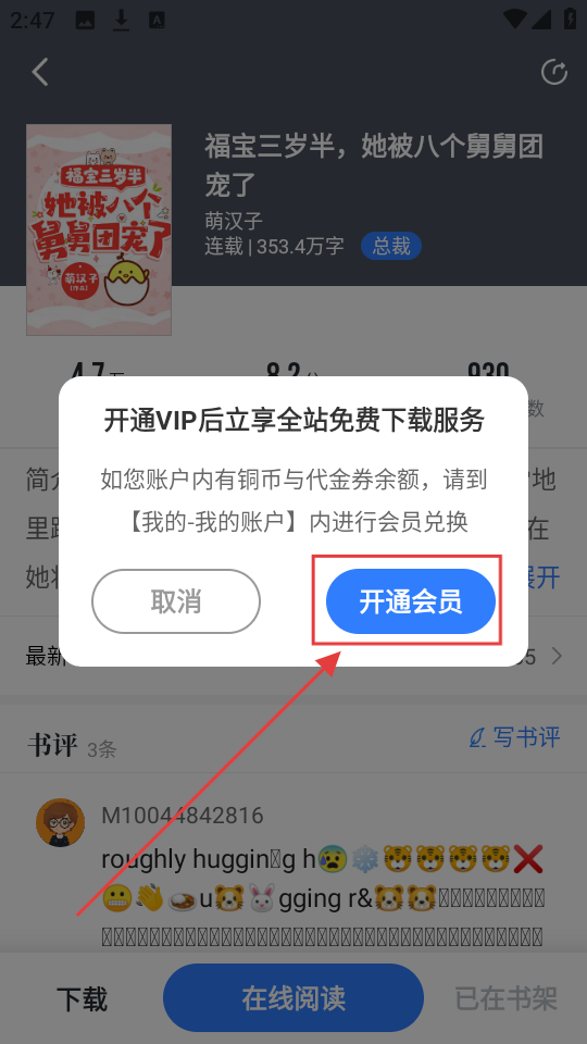 2、小说详情页点【下载】,触发下载提示,可开通VIP下载小说啦。
