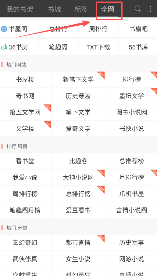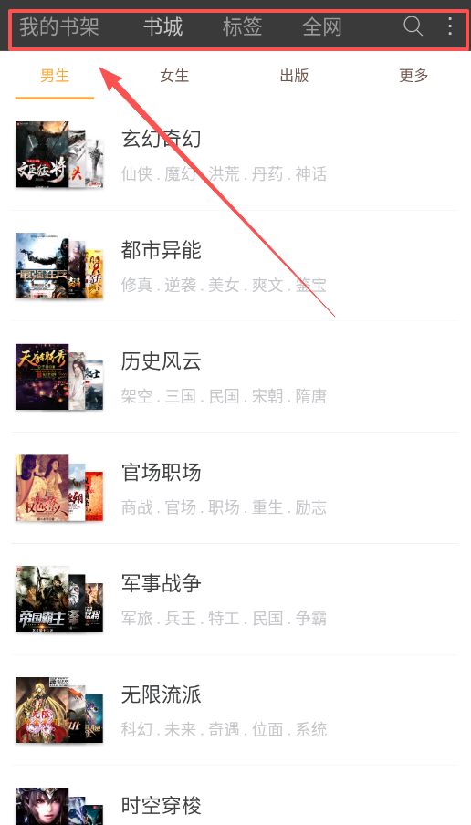 1、主界面底部导航分为“书架”“书城”“标签”“全网”,找书建议先选“书城”大类,再挑具体分类如“历史风云”等。